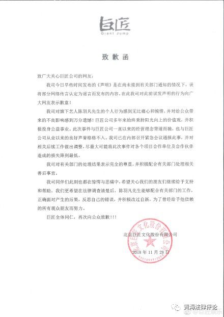 经纪公司第一时间辟谣,陈羽凡本人也微博上发博,以力证自己人身自由不受限制的,底气也许来源于法律上已知悉不涉及刑事犯罪,最多只行政拘留20日。